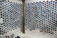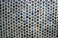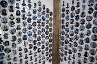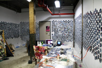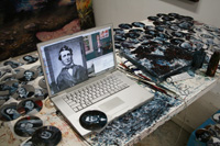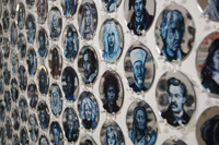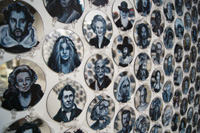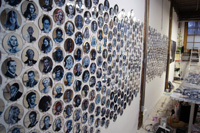 The images below are from Gareth Bate's studio. They show the current development of his Jewel Net of Indra installation which will take several years to complete. Gareth has now painted 1600 people, the original installation was 325. His ultimate goal is 6765. The finished version won't be exhibited for several years. Because the mirrors are now on opposite walls you can see the infinite reflection aspect that didn't happen in the original installation. See the first installation | Read Artist Statement and List of Names